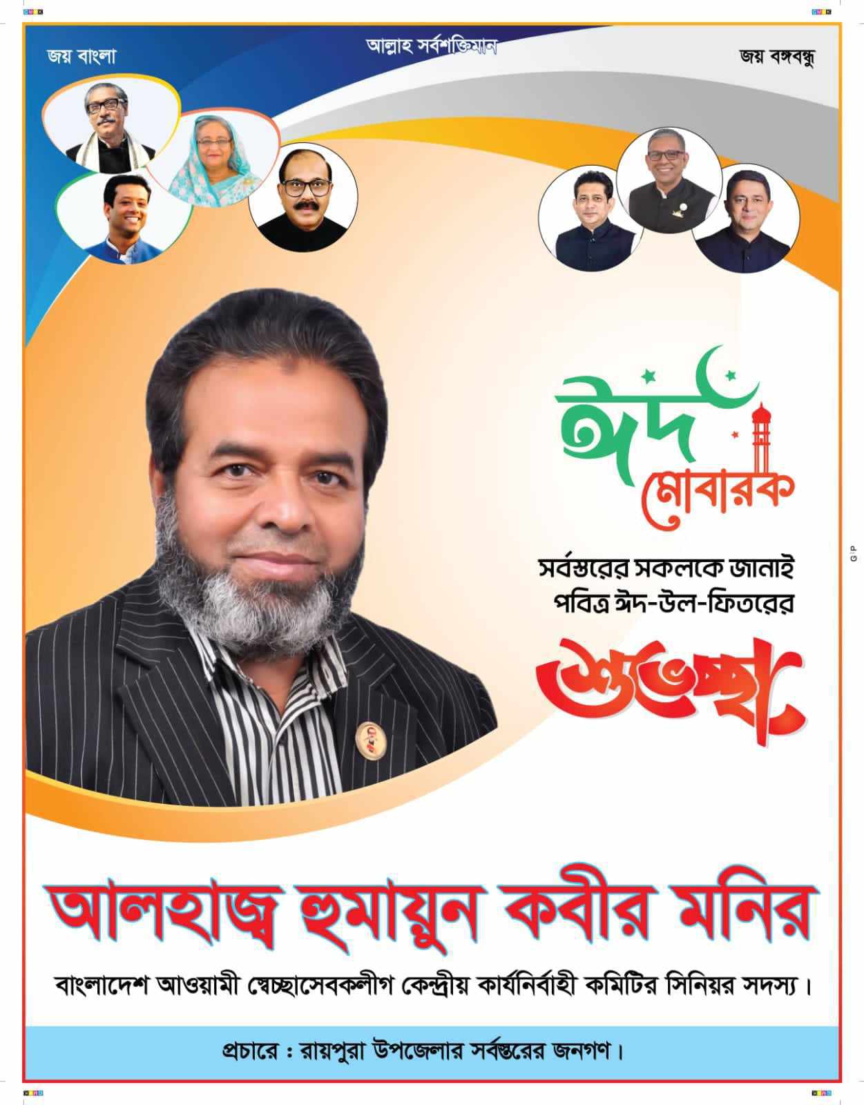 পবিত্র ঈদ-উল-ফিতর উপলক্ষে রায়পুরাবাসীকে ঈদের শুভেচ্ছা জানিয়েছেন বাংলাদেশ আওয়ামী স্বেচ্ছাসেবকলীগ কেন্দ্রীয় কার্যনির্বাহী কমিটির সিনিয়র সদস্য ও উপজেলা চেয়ারম্যান পদপ্রার্থী আলহাজ্ব হুমায়ুন কবীর মনির।