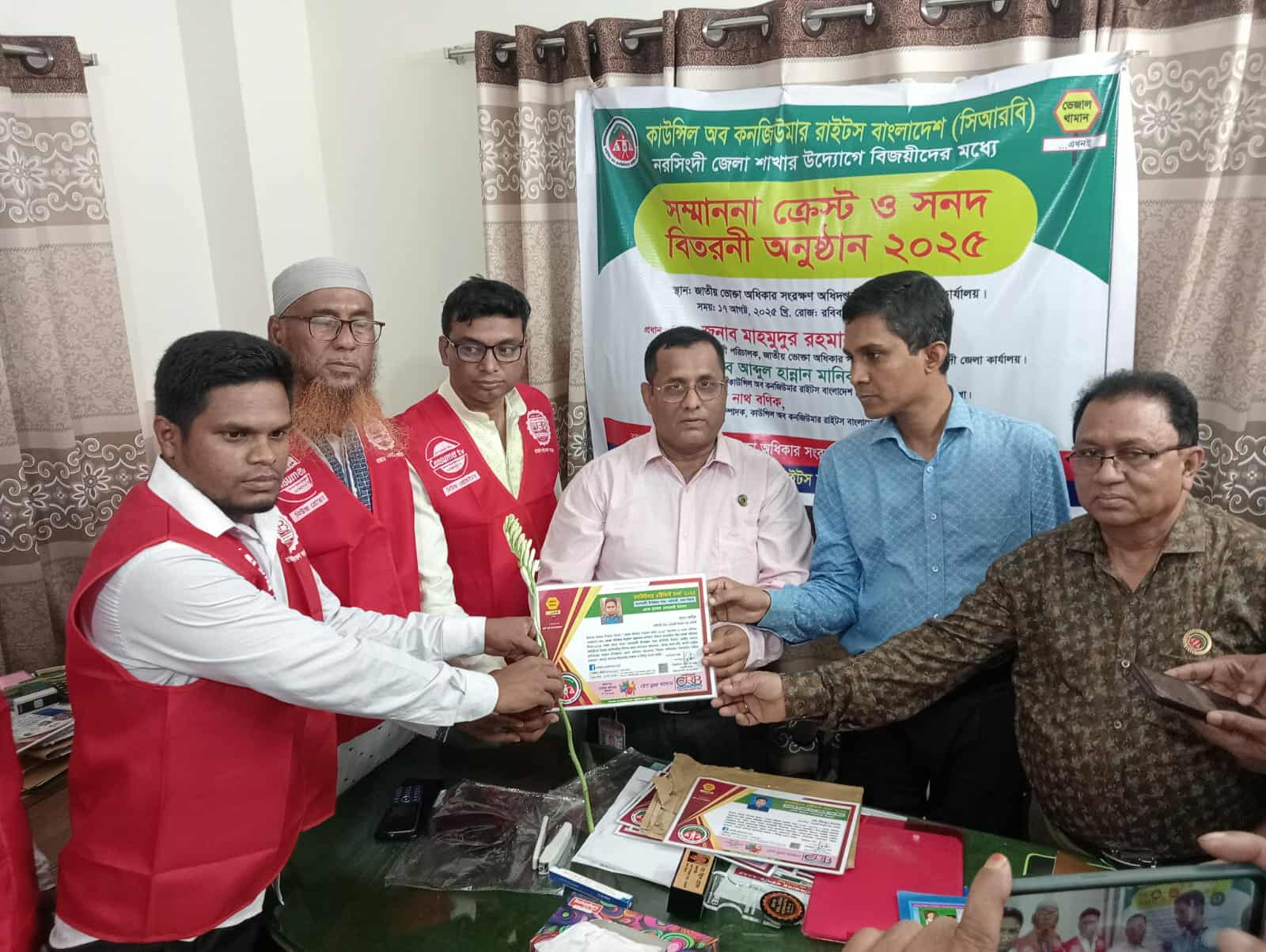 কাউন্সিল অব কনজিউমার রাইটস বাংলাদেশ (সি আর বি) নরসিংদী জেলা শাখার উদ্যোগে বিজয়ীদের মাঝে সম্মাননা ক্রেস্ট ও সনদ বিতরণ অনুষ্ঠান অনুষ্ঠিত হয়েছে।