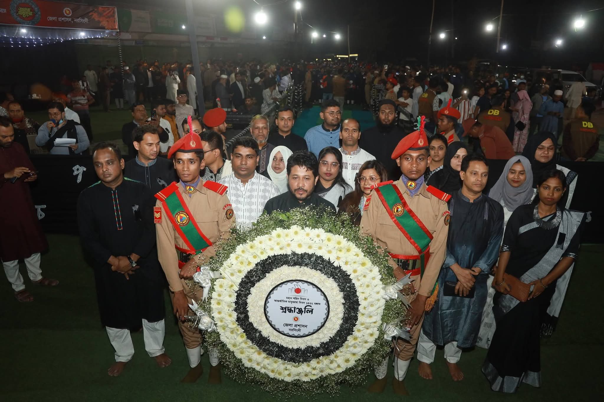 জেলা প্রশাসক মোহাম্মদ আনোয়ার হোসাইনের নেতৃত্বে জেলা প্রশাসনের কর্মকর্তা-কর্মচারীরা শহীদ মিনারে পুষ্পস্তবক অর্পণ করেন। এ সময় জেলা পুলিশ নরসিংদী, বীর মুক্তিযোদ্ধাগণ, বিভিন্ন সরকারি দপ্তরের কর্মকর্তা, রাজনৈতিক ও সামাজিক সংগঠনের নেতৃবৃন্দ এবং সর্বস্তরের মানুষ উপস্থিত ছিলেন।