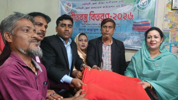 রায়পুরায় কাঁকন সংগীতদল ও কালচারাল ফাউন্ডেশনের উদ্যোগে শীতবস্ত্র বিতরণ
