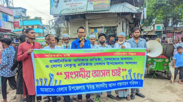 মোঃ বাদল মিয়া, বেলাব (নরসিংদী) প্রতিনিধি: রাজনৈতিক অধিকার প্রতিষ্ঠা,বৈষম্যের অবসান ও যোগ্য নেতৃত্ব প্রতিষ্ঠায় বেলাব উপজেলায় আলাদা সংসদীয় আসনের দাবিতে মানব বন্ধন অনুষ্ঠিত হয়েছে। বেলাব উপজেলায় স্বতন্ত্র সংসদীয় আসন