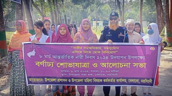 মোঃ বাদল মিয়া, বেলাব (নরসিংদী) প্রতিনিধি: ”নারীর সমঅধিকার, সমসুযোগ এগিয়ে নিতে হোক বিনিয়োগ ”এই প্রতিপাদ্যকে সামনে রেখে নরসিংদীর বেলাবতে পালিত হয়েছে জাতীয় আন্তর্জাতিক নারী দিবস অনুষ্ঠিত হয়েছে। শুক্রবার (৮ মার্চ)