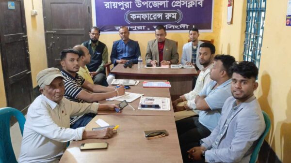 শফিকুল ইসলাম, রায়পুরা উপজেলা প্রতিনিধি: নরসিংদীর রায়পুরা উপজেলা প্রেসক্লাবের মাসিক সভা অনুষ্ঠিত হয়েছে। শনিবার বিকেলে পৌর এলাকার অফিস কক্ষে এ সভা হয়। এসময় রায়পুরা উপজেলা প্রেসক্লাবের সভাপতি হারুনূর রশিদ